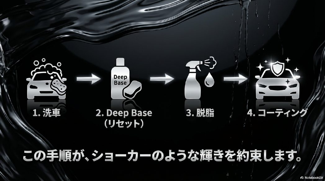 ながら洗車ブランドの製品ラインナップにおいて、Deep Baseはあくまで「下地処理(Preparation)」を担当する役者です。映画で言えば助演男優賞のような存在で、主役となる「トップコート(Protection)」を引き立てるために不可欠な土台作りを行います。